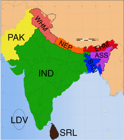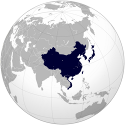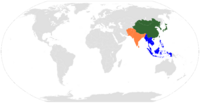 An image of the "Eastern world" defined as the "Far East", consisting of three overlapping cultural blocks: East Asia (Green), Southeast Asia (Blue), and South Asia (Orange)