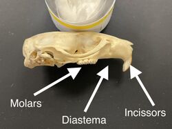 The distinguishing feature of the rodents is their pairs of continuously growing, razor-sharp, open-rooted incisors.[2] These incisors have thick layers of enamel on the front and little enamel on the back.[3] Because they do not stop growing, the animal must continue to wear them down so that they do not reach and pierce the skull. As the incisors grind against each other, the softer dentine on the rear of the teeth wears away, leaving the sharp enamel edge shaped like the blade of a chisel.[4] Most species have up to 22 teeth with no canines or anterior premolars. A gap, or diastema, occurs between the incisors and the cheek teeth in most species. This allows rodents to suck in their cheeks or lips to shield their mouth and throat from wood shavings and other inedible material, discarding this waste from the sides of their mouths.[citation needed] Chinchillas and guinea pigs have a high-fiber diet; their molars have no roots and grow continuously like their incisors.[5]