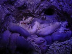 Perhaps the most extreme examples of colonial behavior in rodents are the eusocial naked mole rat and Damaraland mole rat. The naked mole rat lives completely underground and can form colonies of up to 80 individuals. Only one female and up to three males in the colony reproduce, while the rest of the members are smaller and sterile, and function as workers. Some individuals are of intermediate size. They help with the rearing of the young and can take the place of a reproductive if one dies.[38] The Damaraland mole rat is characterized by having a single reproductively active male and female in a colony where the remaining animals are not truly sterile, but become fertile only if they establish a colony of their own.[45]