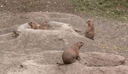 Among the most social of rodents are the ground squirrels, which typically form colonies based on female kinship, with males dispersing after weaning and becoming nomadic as adults. Cooperation in ground squirrels varies between species and typically includes making alarm calls, defending territories, sharing food, protecting nesting areas, and preventing infanticide.[44] The black-tailed prairie dog forms large towns that may cover many hectares. The burrows do not interconnect, but are excavated and occupied by territorial family groups known as coteries. A coterie often consists of an adult male, three or four adult females, several nonbreeding yearlings, and the current year's offspring. Individuals within coteries are friendly with each other, but hostile towards outsiders.[39]