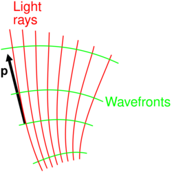 In optics, a ray is an idealized geometrical model of light or other electromagnetic radiation, obtained by choosing a curve that is perpendicular to the wavefronts of the actual light, and that points in the direction of energy flow.[1][2] Rays are used to model the propagation of light through an optical system, by dividing the real light field up into discrete rays that can be computationally propagated through the system by the techniques of ray tracing. This allows even very complex optical systems to be analyzed mathematically or simulated by computer. Ray tracing uses approximate solutions to Maxwell's equations that are valid as long as the light waves propagate through and around objects whose dimensions are much greater than the light's wavelength. Ray optics or geometrical optics does not describe phenomena such as diffraction, which require wave optics theory. Some wave phenomena such as interference can be modeled in limited circumstances by adding phase to the ray model.