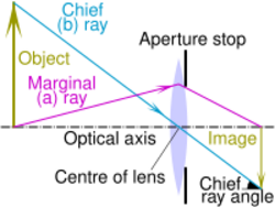 The principal ray or chief ray (sometimes known as the b ray) in an optical system is the meridional ray that starts at an edge of an object and passes through the center of the aperture stop.[5][8][7] The distance between the chief ray (or an extension of it for a virtual image) and the optical axis at an image location defines the size of the image. This ray (or forward and backward extensions of it for virtual image pupils) crosses the optical axis at the locations of the entrance and exit pupils. The marginal and chief rays together define the Lagrange invariant, which characterizes the throughput or etendue of the optical system.[9] Some authors define a "principal ray" for each object point, and in this case, the principal ray starting at an edge point of the object may then be called the marginal principal ray.[6]