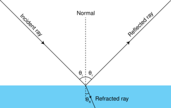 Diagram of rays at a surface, where [math]\displaystyle{ \theta_\mathrm i }[/math] is the angle of incidence, [math]\displaystyle{ \theta_\mathrm r }[/math] is the angle of reflection, and [math]\displaystyle{ \theta_\mathrm R }[/math] is the angle of refraction.