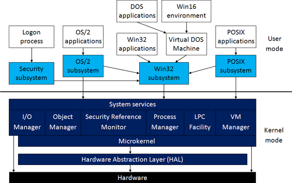 The third goal was called personality: The operating system should be able to run applications designed for various operating systems, such as Windows, MS-DOS and OS/2 applications.[6]: 54 The Mach kernel followed a similar concept by moving the APIs to components which operated in user mode as applications, these could be changed and new ones could be added. This principle was applied to Windows NT.[8]: 6
