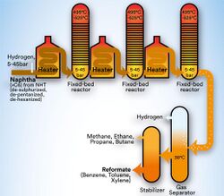 From Handwiki Catalytic reforming is a chemical process used to convert petroleum refinery naphthas distilled from crude oil (typically having low octane ratings) into high-octane liquid products called reformates, which are premium blending stocks for high-octane gasoline. The process converts low-octane linear hydrocarbons (paraffins) into branched alkanes (isoparaffins) and cyclic naphthenes, which are then partially dehydrogenated to produce high-octane aromatic hydrocarbons. The dehydrogenation also produces significant amounts of byproduct hydrogen gas, which is fed into other refinery processes such as hydrocracking. A side reaction is hydrogenolysis, which produces light hydrocarbons of lower value, such as methane, ethane, propane and butanes.
