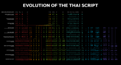 The Sukhothai script changed little as it spread southward, as today's modern Thai script has changed remarkably little from the Sukhothai script.[4] The Sukhothai script developed into the Thai script in the lower basin of the Chao Phraya River, as this development can be traced over the course of the following centuries.[1] During King Lithai's reign in the late 14th century, literate individuals were still familiar with the Khmer script and therefore refused to write in the Sukhothai script. To address this, the script was modified to more closely resemble the Khmer script in the way vowels are written.[6] The changes that were introduced resulted in a new script in 1375, called the "King Li Thai script". This script wrote vowel signs above, below, before or after an initial consonant. In 1680 this script was succeeded by the "King Narai script", which has been developed and preserved as the modern Thai script of today.[7]