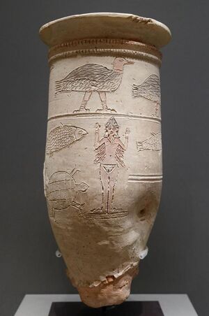 There were also religious embellishments found within the “East Building”, such as vases and other vessels that seemed to be connected to religious rituals. The vessels were covered in motifs related to sacrilegious rituals, such as the sacral knot and the image of birds flying freely. The functions of the vessels would have been offering food or liquid in relation to the rituals. Combining these two factors, it is a possibility that sacred prostitution existed within this building.[50]