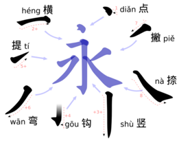 The Eight Principles of Yong explain how to write eight common strokes in regular script which are found all in one character, 永 (pinyin: yǒng, "forever", "permanence"). It was traditionally believed that the frequent practice of these principles as a beginning calligrapher could ensure beauty in one's writing.