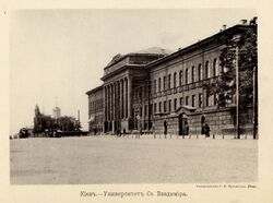 [ ⚑ ] 50°26′30.85″N 30°30′40.73″E / 50.4419028°N 30.5113139°E Shevchenko University or officially the Taras Shevchenko National University of Kyiv[2] (Ukrainian: Київський національний університет імені Тараса Шевченка), colloquially known in Ukrainian as KNU (Ukrainian: Київський національний універcитет - КНУ) is located in Kiev, the capital of Ukraine. KNU is ranked within top 550 universities in the world.[3] It is the third oldest university in Ukraine after the University of Lviv and University of Kharkiv. Currently, its structure consists of fifteen faculties (academic departments) and five institutes. It was founded in 1834 by the Russian Tsar Nikolai I[4] as the Kiev Imperial University of Saint Vladimir, and since then it has changed its name several times. During the Soviet Union era, Taras Shevchenko University was one of the top-three universities in the USSR, along with Moscow State University and Leningrad State University. It is ranked as the best university in Ukraine in many rankings (see below). Throughout history, the university has produced many famous alumni including Nikolay Bunge, Mykhailo Drahomanov, Mykhailo Hrushevskyi, Nikolai Berdyaev, Mikhail Bulgakov, Ivan Schmalhausen, Theodosius Dobzhansky, Viacheslav Chornovil, Leonid Kravchuk, and many others. Taras Shevchenko himself, banned from educational activities for political reasons, worked for the Kyiv University as a field researcher.