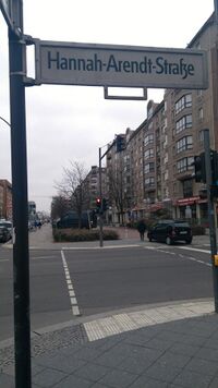 Hannah Arendt's life and work continue to be commemorated in many different ways, including plaques (Gedenktafeln) indicating places she has lived. Public places and institutions bear her name,[416] including schools.[417] There is also a Hannah Arendt Day (Hannah Arendt Tag) in her birthplace.[418] Objects named after her vary from asteroids to trains[369][370] and she has been commemorated in stamps. Museums and foundations include her name.[419]