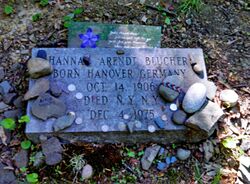 Heinrich Blücher had survived a cerebral aneurysm in 1961 and remained unwell after 1963, sustaining a series of heart attacks. On 31 October 1970 he died of a massive heart attack. A devastated Arendt had previously told Mary McCarthy, "Life without him would be unthinkable".[210] Arendt was also a heavy smoker and was frequently depicted with a cigarette in her hand. She sustained a near fatal heart attack while lecturing in Scotland in May 1974, and although she recovered, she remained in poor health afterwards, and continued to smoke.[211] On the evening of 4 December 1975, shortly after her 69th birthday, she had a further heart attack in her apartment while entertaining friends, and was pronounced dead at the scene.[212][213] Her ashes were buried alongside those of Blücher at Bard College, in Annandale-on-Hudson, New York in May 1976.[181][214]