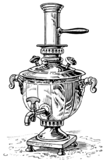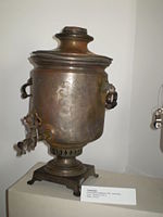 A samovar (Russian: самовар, Russian pronunciation: [səmɐˈvar]) is a heated metal container traditionally used to boil water in Russia. In its traditional form, a central tube runs up the middle of the container and is filled with burning charcoal, heating the surrounding water. Since the heated water is usually used for making tea, many samovars have an attachment on the tops of their lids to hold and heat a teapot filled with tea concentrate. Though traditionally heated with coal or charcoal, many newer samovars use electricity and heat water in a manner similar to an electric water boiler.