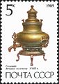 A nineteenth-century samovar, depicted on a 1989 USSR postage stamp.