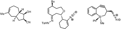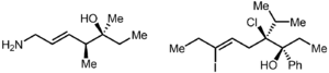 ↑In this gallery, double bonds have been shown in red and triple bonds in blue. This was added for clarity – multiple bonds are not normally coloured in skeletal formulae.