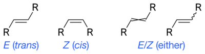 Skeletal formulae can depict cis and trans isomers of alkenes. Wavy single bonds are the standard way to represent unknown or unspecified stereochemistry or a mixture of isomers (as with tetrahedral stereocenters). A crossed double-bond has been used sometimes; it is no longer considered an acceptable style for general use but may still be required by computer software.[5]