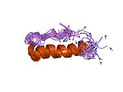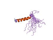 Peptide YY is related to the pancreatic peptide family by having 18 of its 36 amino acids located in the same positions as pancreatic peptide.[4] The two major forms of peptide YY are PYY1-36 and PYY3-36, which have PP fold structural motifs. However, the most common form of circulating PYY immunoreactivity is PYY3-36, which binds to the Y2 receptor (Y2R) of the Y family of receptors.[5] Peptide YY3-36 (PYY) is a linear polypeptide consisting of 34 amino acids with structural homology to NPY and pancreatic polypeptide.