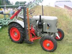 Larger mowers are usually ganged (equipped with a number or gang of similar cutting units), so they can adapt individually to ground contours. They may be powered and drawn by a tractor or draft animals. The cutting units can be mounted underneath the tractor between the front and rear wheels, mounted on the back with a three-point hitch or pulled behind the tractor as a trailer. There are also dedicated self-propelled cutting machines, which often have the mower units mounted at the front and sides for easy visibility by the driver. Boom or side-arm mowers are mounted on long hydraulic arms, similar to a backhoe arm, which allows the tractor to mow steep banks or around objects while remaining on a safer surface.
