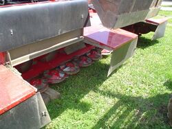 Rotary mowers, also called drum mowers, have a rapidly rotating bar, or disks mounted on a bar, with sharpened edges that cut the crop. When these mowers are tractor-mounted they are easily capable of mowing grass at up to 10 miles per hour (16 km/h) in optimal conditions. Some models are designed to be mounted in double and triple sets on a tractor, one in the front and one at each side, thus able to cut up to 20 foot (6 metre) swaths.