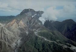 The 1991 eruption rated 6 on the Volcanic Explosivity Index and came some 450–500 years after the volcano's last known eruptive activity. The eruption ejected about 10 km3 (2.4 cu mi) of material, making it the largest eruption of the 20th century since that of Novarupta in 1912 and some ten times larger than the 1980 eruption of Mount St. Helens. Ejected material such as tephra fallout and pyroclastic flow deposits are much less dense than magma, and the volume of ejected material was equivalent to about four cubic kilometres (0.96 cu mi) of unerupted material.[15] Thermal energy released during the eruption was equal to 70 megatons of TNT.[16]