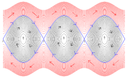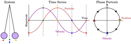 Here the horizontal axis gives the position, and vertical axis the velocity. As the system evolves, its state follows one of the lines (trajectories) on the phase diagram.