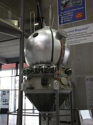 The Soviets designed their first human space capsule using the same spacecraft bus as their Zenit spy satellite,[93] forcing them to keep the details and true appearance secret until after the Vostok program was over. The craft consisted of a spherical descent module with a mass of 2.46 tonnes (5,400 lb) and a diameter of 2.3 meters (7.5 ft), with a cylindrical inner cabin housing the cosmonaut, instruments, and escape system; and a biconic instrument module with a mass of 2.27 tonnes (5,000 lb), 2.25 meters (7.4 ft) long and 2.43 meters (8.0 ft) in diameter, containing the engine system and propellant. After reentry, the cosmonaut would eject at about 7,000 meters (23,000 ft) over the USSR and descend via parachute, while the capsule would land separately, because the descent module made an extremely rough landing that could have left a cosmonaut seriously injured.[94] The "Vostok spaceship" was first displayed at the July 1961 Tushino air show, mounted on its launch vehicle's third stage, with the nose cone in place concealing the spherical capsule. A tail section with eight fins was added in an apparent attempt to confuse western observers. This also appeared on official commemorative stamps and a documentary.[95] The Soviets finally revealed the true appearance of their Vostok capsule at the April 1965 Moscow Economic Exhibition.