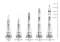 Design work began in 1953 on the R-7 Semyorka with the requirement for a missile with a launch mass of 170 to 200 tons, range of 8,500 km and carrying a 3,000 kg (6,600 lb) nuclear warhead, powerful enough to launch a nuclear warhead against the United States. In late 1953 the warhead’s mass was increased to 5.5 to 6 tons to accommodate the then planned theromonuclear bomb.[38][39] On the 21 August 1957 the R-7 flew 6,000 km (3,700 mi), and became the worlds’s first intercontinental ballistic missile.[40][39] Two months later the R-7 launched Sputnik 1, the first artificial satellite, into orbit, and became the basis for the R-7 family which includes Sputnik, Luna, Molniya, Vostok, and Voskhod space launchers, as well as later Soyuz variants. Several versions are still in use and it has become the world’s most reliable space launcher.[41][42]