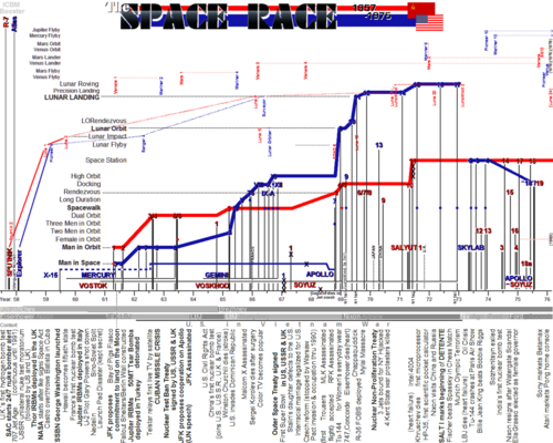 From Handwiki The Space Race was a 20th-century competition between two Cold War rivals, the United States and the Soviet Union, to achieve superior spaceflight capability. It had its origins in the ballistic missile-based nuclear arms race between the two nations following World War II and had its peak with the more particular Moon Race to land on the Moon between the US moonshot and Soviet moonshot programs. The technological advantage demonstrated by spaceflight achievement was seen as necessary for national security and became part of the symbolism and ideology of the time. The Space Race brought pioneering launches of artificial satellites, robotic space probes to the Moon, Venus, and Mars, and human spaceflight in low Earth orbit and ultimately to the Moon.[1]