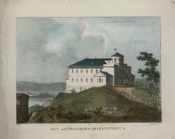 Prior to 1934, the university's astronomy efforts revolved around the University Observatory (Norwegian: Universitetsobservatoriet, abbreviated Observatoriet, lit. the Observatory) located downtown Oslo.[1] The first observation facilities were provided in 1815 to the newly appointed professor Christopher Hansteen of the recently established Royal Frederick University (which was renamed the University of Oslo in 1939) in an octagonal shack[2][3] at Akershus Festning, Christiania. Construction began in 1831 on a larger observatory which also could house Hansteen and his family. At its completion in 1833 it became the first building to have been erected by the university.