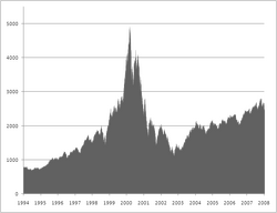 The Nasdaq crash and technology slump that started in March 2000 shook virtually the entire venture capital industry as valuations for startup technology companies collapsed. Over the next two years, many venture firms had been forced to write-off large proportions of their investments, and many funds were significantly "under water" (the values of the fund's investments were below the amount of capital invested). Venture capital investors sought to reduce the size of commitments they had made to venture capital funds, and, in numerous instances, investors sought to unload existing commitments for cents on the dollar in the secondary market. By mid-2003, the venture capital industry had shriveled to about half its 2001 capacity. Nevertheless, PricewaterhouseCoopers' MoneyTree Survey[26] shows that total venture capital investments held steady at 2003 levels through the second quarter of 2005.