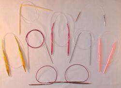The third needle type consists of circular needles, which are long, flexible double-pointed needles. The two tapered ends (typically 5 inches (130 mm) long) are rigid and straight, allowing for easy knitting; however, the two ends are connected by a flexible strand (usually nylon) that allows the two ends to be brought together. Circular needles are typically 24-60 inches long, and are usually used singly or in pairs; again, the width of the knitted piece may be significantly longer than the length of the circular needle. Interchangeable needles are a subset of circular needles. They are kits consist of pairs of needles with usually nylon cables or cords. The cables/cords are screwed into the needles, allowing the knitter to have both flexible straight needles or circular needles. This also allows the knitter to change the diameter and length of the needles as needed. The needles must be screwed on tightly, otherwise yarn can snag and become damaged.