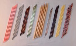 There are three basic types of knitting needles (also called "knitting pins"). The first and most common type consists of two slender, straight sticks tapered to a point at one end, and with a knob at the other end to prevent stitches from slipping off. Such needles are usually 10–16 inches (250–410 mm) long but, due to the compressibility of knitted fabrics, may be used to knit pieces significantly wider. The most important property of needles is their diameter, which ranges from below 2 to 25 mm (roughly 1 inch). The diameter affects the size of stitches, which affects the gauge/tension of the knitting and the elasticity of the fabric. Thus, a simple way to change gauge/tension is to use different needles, which is the basis of uneven knitting. Although the diameter of the knitting needle is often measured in millimeters, there are several measurement systems, particularly those specific to the United States , the United Kingdom and Japan ; a conversion table is given at knitting needle. Such knitting needles may be made out of any materials, but the most common materials are metals, wood, bamboo, and plastic. Different materials have different frictions and grip the yarn differently; slick needles such as metallic needles are useful for swift knitting, whereas rougher needles such as bamboo offer more friction and are therefore less prone to dropping stitches. The knitting of new stitches occurs only at the tapered ends. Needles with lighted tips have been sold to allow knitters to knit in the dark.