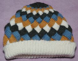 Not every stitch in a row need be knitted; some may be 'missed' (unknitted and passed to the active needle) and knitted on a subsequent row. This is known as slip-stitch knitting.[9] The slipped stitches are naturally longer than the knitted ones. For example, a stitch slipped for one row before knitting would be roughly twice as tall as its knitted counterparts. This can produce interesting visual effects, although the resulting fabric is more rigid because the slipped stitch 'pulls' on its neighbours and is less deformable. Mosaic knitting is a form of slip-stitch knitting that knits alternate colored rows and uses slip stitches to form patterns; mosaic-knit fabrics tend to be stiffer than patterned fabrics produced by other methods such as Fair-Isle knitting.[10]