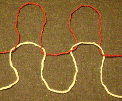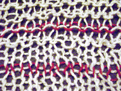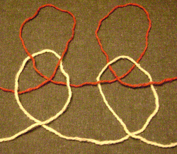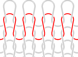 The topology of a knitted fabric is relatively complex. Unlike woven fabrics, where strands usually run straight horizontally and vertically, yarn that has been knitted follows a looped path along its row, as with the red strand in the diagram at left, in which the loops of one row have all been pulled through the loops of the row below it.