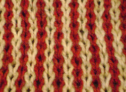 In the simplest of hand-knitted fabrics, every row of stitches are all knit (or all purl); this creates a garter stitch fabric. Alternating rows of all knit stitches and all purl stitches creates a stockinette pattern/stocking stitch. Vertical stripes (ribbing) are possible by having alternating wales of knit and purl stitches. For example, a common choice is 2x2 ribbing, in which two wales of knit stitches are followed by two wales of purl stitches, etc. Horizontal striping (welting) is also possible, by alternating rows of knit and purl stitches. Checkerboard patterns (basketweave) are also possible, the smallest of which is known as seed/moss stitch: the stitches alternate between knit and purl in every wale and along every row.