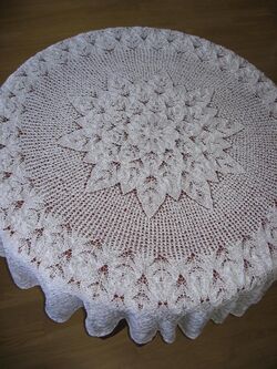 A wale can split into two or more wales using increases, most commonly involving a yarn over. Depending on how the increase is done, there is often a hole in the fabric at the point of the increase. This is used to great effect in lace knitting, which consists of making patterns and pictures using such holes, rather than with the stitches themselves.[13] The large and many holes in lacy knitting makes it extremely elastic; for example, some Shetland "wedding-ring" shawls are so fine that they may be drawn through a wedding ring.