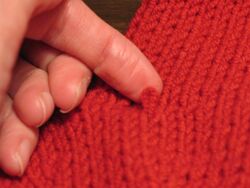 If they are not secured, the loops of a knitted course will come undone when their yarn is pulled; this is known as ripping out, unravelling knitting, or humorously, frogging (because you 'rip it', this sounds like a frog croaking: 'rib-bit').[2] To secure a stitch, at least one new loop is passed through it. Although the new stitch is itself unsecured ("active" or "live"), it secures the stitch(es) suspended from it. A sequence of stitches in which each stitch is suspended from the next is called a wale.[3] To secure the initial stitches of a knitted fabric, a method for casting on is used; to secure the final stitches in a wale, one uses a method of binding/casting off. During knitting, the active stitches are secured mechanically, either from individual hooks (in knitting machines) or from a knitting needle or frame in hand-knitting.