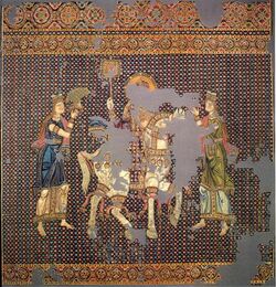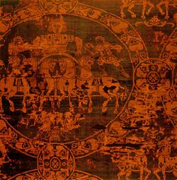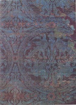 Figured (patterned) Byzantine silks of the 6th (and possibly 5th) centuries show overall designs of small motifs such as hearts, swastikas, palmettes and leaves worked in two weft colours.[11] Later, recognizable plant motifs (such as lotus leaves and flowers) and human figures appear. Surviving textiles document a rich exchange of techniques and iconographic themes between Constantinople and the newly-Islamic textile centres of the Mediterranean and Central Asia in the years after the Muslim conquests of the 7th century. Designs of the 8th and 9th centuries show rows of roundels or medallions populated with pairs of human or animal figures reversed in mirror-image on a vertical axis.[15] Many motifs echo Sassanian designs including the tree of life, winged horses, lions, and imaginary beasts,[2] and there are numbers of surviving pieces where specialists cannot agree between a Byzantine or Islamic origin.[16] Fashionable patterns evoked the activities and interests of the royal court, such as hunting scenes or the quadriga (four-horse chariot).[15]