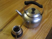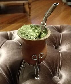 Mate or maté[lower-alpha 1] (/ˈmɑːteɪ/ MAH-tay, Spanish: [ˈmate], Portuguese: [ˈmatʃi]) is a traditional South American caffeine-rich infused herbal drink. It is also known as chimarrão[lower-alpha 2] or cimarrón,[lower-alpha 3] and ka’ay in Guarani.[2] It is made by soaking dried yerba mate (Ilex paraguariensis) leaves in hot water and is traditionally served with a metal straw (bombilla) in a container typically made from a calabash gourd (also called the mate), but also made from a cattle horn (guampa) in some areas. A very similar preparation, known as mate cocido, removes some of the plant material and sometimes comes in tea bags. Today, mate is sold commercially in tea bags and as bottled iced tea.