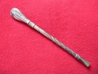 The metal straw is known as a bombilla or bomba and is traditionally made of silver. Modern straws are typically made of nickel silver, stainless steel, or hollow-stemmed cane. The bombilla functions both as a straw and as a sieve. The submerged end is flared, with small holes or slots that allow the brewed liquid in, but block the chunky matter that makes up much of the mixture. A modern bombilla design uses a straight tube with holes or a spring sleeve to act as a sieve.[7]