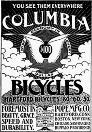They also served to teach the industrial models later adopted, including mechanization and mass production (later copied and adopted by Ford and General Motors),[81][82][83] vertical integration[82] (also later copied and adopted by Ford), aggressive advertising[84] (as much as 10% of all advertising in U.S. periodicals in 1898 was by bicycle makers),[85] lobbying for better roads (which had the side benefit of acting as advertising, and of improving sales by providing more places to ride),[83] all first practiced by Pope.[83] In addition, bicycle makers adopted the annual model change[81][86] (later derided as planned obsolescence, and usually credited to General Motors), which proved very successful.[87]