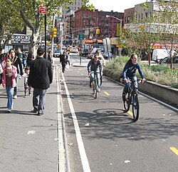 In built-up cities around the world, urban planning uses cycling infrastructure like bikeways to reduce traffic congestion and air pollution.[66] A number of cities around the world have implemented schemes known as bicycle sharing systems or community bicycle programs.[67][68] The first of these was the White Bicycle plan in Amsterdam in 1965. It was followed by yellow bicycles in La Rochelle and green bicycles in Cambridge. These initiatives complement public transport systems and offer an alternative to motorized traffic to help reduce congestion and pollution.[69] In Europe, especially in the Netherlands and parts of Germany and Denmark, bicycle commuting is common. In Copenhagen, a cyclists' organization runs a Cycling Embassy that promotes biking for commuting and sightseeing. The United Kingdom has a tax break scheme (IR 176) that allows employees to buy a new bicycle tax free to use for commuting.[70]