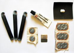 There are specialized bicycle tools for use both in the shop and at the roadside. Many cyclists carry tool kits. These may include a tire patch kit (which, in turn, may contain any combination of a hand pump or CO2 pump, tire levers, spare tubes, self-adhesive patches, or tube-patching material, an adhesive, a piece of sandpaper or a metal grater (for roughing the tube surface to be patched) and sometimes even a block of French chalk), wrenches, hex keys, screwdrivers, and a chain tool. Special, thin wrenches are often required for maintaining various screw-fastened parts, specifically, the frequently lubricated ball-bearing "cones".[64][65] There are also cycling-specific multi-tools that combine many of these implements into a single compact device. More specialized bicycle components may require more complex tools, including proprietary tools specific for a given manufacturer.