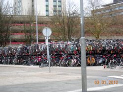 In the Netherlands all train stations offer free bicycle parking, or a more secure parking place for a small fee, with the larger stations also offering bicycle repair shops. Cycling is so popular that the parking capacity may be exceeded, while in some places such as Delft the capacity is usually exceeded.[71] In Trondheim in Norway, the Trampe bicycle lift has been developed to encourage cyclists by giving assistance on a steep hill. Buses in many cities have bicycle carriers mounted on the front.