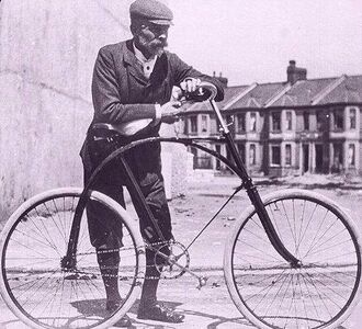 The first mechanically propelled, two-wheeled vehicle may have been built by Kirkpatrick MacMillan, a Scottish blacksmith, in 1839, although the claim is often disputed.[19] He is also associated with the first recorded instance of a cycling traffic offense, when a Glasgow newspaper in 1842 reported an accident in which an anonymous "gentleman from Dumfries-shire... bestride a velocipede... of ingenious design" knocked over a little girl in Glasgow and was fined five shillings (Error when using {{Inflation}}: NaN, check parameters for non-numeric data: |value=Template:£sd (parameter 2).).[20]