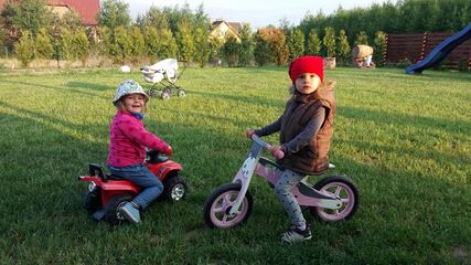 Children's bicycles may be outfitted with cosmetic enhancements such as bike horns, streamers, and spoke beads.[57] Training wheels are sometimes used when learning to ride, but a dedicated balance bike teaches independent riding more effectively.[58][59]