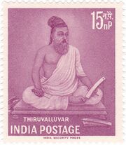 Various claims have been made regarding Valluvar's family background and occupation in the colonial era literature, all inferred from selective sections of his text or hagiographies published since the colonial era started in Tamil Nadu.[45] One traditional version claims that he was a Paraiyar weaver.[46] Another theory is that he must have been from the agricultural caste of Vellalars because he extols agriculture in his work.[10] Another states he was an outcaste, born to a Pariah woman and a Brahmin father.[10][45] Mu Raghava Iyengar speculated that "valluva" in his name is a variation of "vallabha", the designation of a royal officer.[10] S. Vaiyapuri Pillai derived his name from "valluvan" (a Paraiyar caste of royal drummers) and theorized that he was "the chief of the proclaiming boys analogous to a trumpet-major of an army".[10][47] The traditional biographies not only are inconsistent, but also contain incredulous claims about the author of the Kural text. Along with various versions of his birth circumstances, many state he went to a mountain and met the legendary Agastya and other sages.[48] There are also accounts claiming that, during his return journey, Valluvar sat under a tree whose shadow sat still over him and did not move the entire day, he killed a demon, and many more.[48] Scholars consider these and all associated aspects of these hagiographic stories to be fiction and ahistorical, a feature common to "international and Indian folklore". The alleged low birth, high birth and being a pariah in the traditional accounts are also doubtful.[49] Traditionally, Valluvar is believed to have married to Vasuki and had a friend and a disciple named Elelasingan.[50][51]