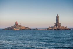 Statues of Valluvar have been erected across the globe, including the ones at Kanyakumari, Chennai, Bengaluru, Pondicherry, Vishakapatnam, Haridwar, Puttalam, Singapore, London and Taiwan.[264][265] The tallest of these is the 41-metre (133 ft) stone statue of Valluvar erected in 2000 atop a small island in the town of Kanyakumari on the southernmost tip of the Indian peninsula, at the confluence of the Bay of Bengal, the Arabian Sea, and the Indian Ocean.[266] This statue is currently India's 25th tallest. A life-size statue of Valluvar is one among an array of statues installed by the Tamil Nadu government on the stretch of the Marina Beach.[267]