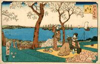 In the Edo period (1603–1867), bento culture spread and became more refined. Travelers and sightseers would carry a simple koshibentō (腰弁当, "waist bento"), consisting of several onigiri wrapped with bamboo leaves or in a woven bamboo box. One of the most popular styles of bento, called makuno-uchi bentō ("between-act bento"), was first made during this period.[7] People who came to see Noh and Kabuki ate specially prepared bentos between maku (acts). Numerous cookbooks were published detailing how to cook, how to pack, and what to prepare for occasions like hanami and Hinamatsuri.