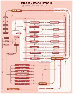 Ekam (Tamil: ஏகம், "the supreme oneness") is the term used in Akilathirattu Ammanai, the holy book of the religion of Ayyavazhi,[4] to represent The Ultimate Oneness. In Thiruvasakam-2 it was stated that it was from this Ekam that all objects, including the separate Godheads, Devas and asuras, of the universe formed. As per Akilam, this state of ekam is beyond the consciousness and derived to beyond the state of changing and is the extreme state in which the whole universe exists.