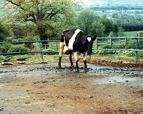Signs are not seen immediately in cattle, due to the disease's extremely long incubation period.[12] Some cattle have been observed to have an abnormal gait, changes in behavior, tremors and hyper-responsiveness to certain stimuli.[13] Hindlimb ataxia affects the animal's gait and occurs when muscle control is lost. This results in poor balance and coordination.[14] Behavioural changes may include aggression, anxiety relating to certain situations, nervousness, frenzy and an overall change in temperament. Some rare but previously observed signs also include persistent pacing, rubbing and licking. Additionally, nonspecific signs have also been observed which include weight loss, decreased milk production, lameness, ear infections and teeth grinding due to pain. Some animals may show a combination of these signs, while others may only be observed demonstrating one of the many reported. Once clinical signs arise, they typically get worse over the subsequent weeks and months, eventually leading to recumbency, coma and death.[13]